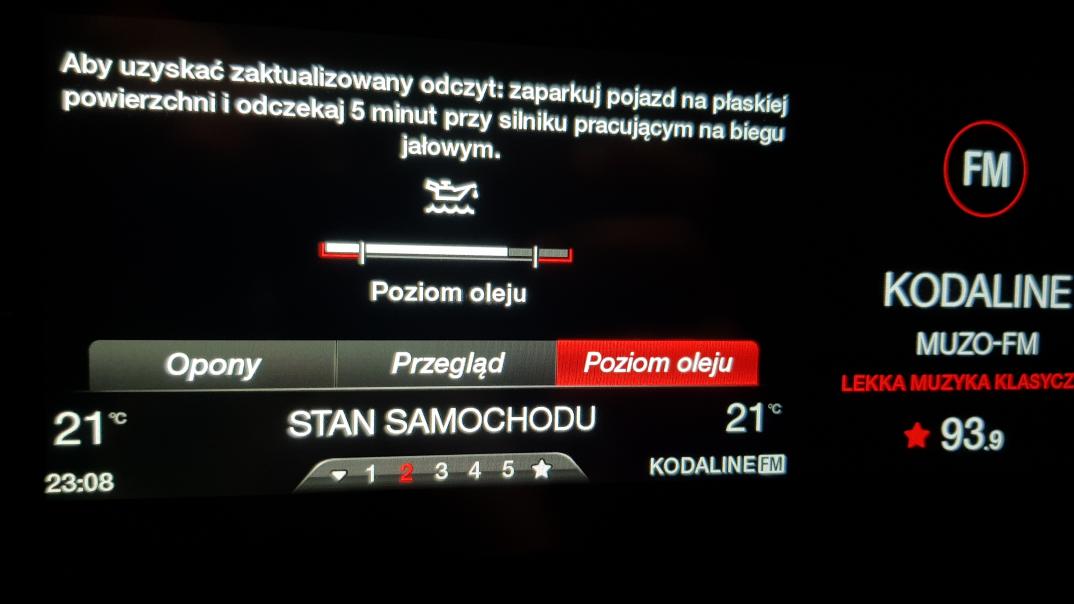 Początkowo myślałem że Giulia już mi wypiła olej bo brakowało kawałek do wypełnienia całego paska. Postanowiłem więc wymusić pomiar. Zrobiłem to co było napisane na ekranie czyli zaparkowałem na równej powierzchni i zostawiłem na biegu jałowym. Nie wiem co to znaczy bieg jałowy w automacie. N? D z hamulcem? P? Wybrałem P. Odczekałem 5min jak w opisie i nic. Żadnego komunikatu. Wyjąłem telefon i zajrzałem do instrukcji Tam jest jeszcze jeden krok. Trzeba wyłączyć silnik po 5min i włączyć ponowni i odczekać 2min. Nie można było tego napisać na ekranie? No dobra zrobiłem i nic. Nie mam pojęcia czy zrobiłem coś, źle czy pomiar się odbył i wskazuje tyle samo.