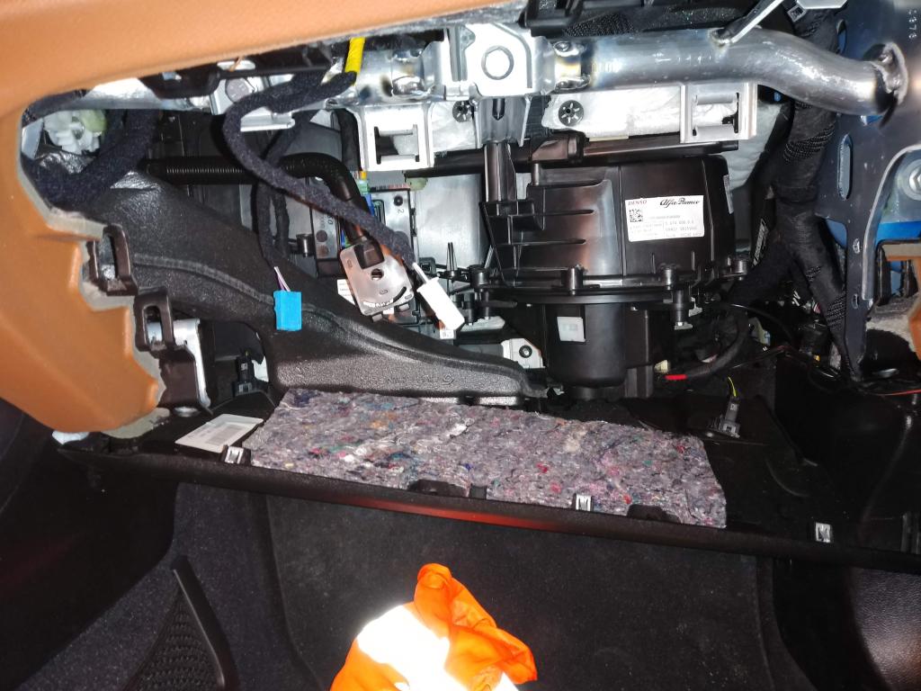 9.schowek trochę w dół, odłączamy kabel od lampki schowka, wyjmujemy z tył odczepia się chłodzenie schowka (nie wiem czy to jest w każdej Giulii, może nie) i odłączamy czujnik zamknięcia schowka