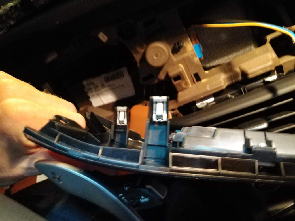 10.podważamy maskownicę prawego nawiewu w desce - chyba 4 zatrzaski, wyjmujemy. eLearn pisze o wyjęciu całego nawiewu, nie wiem po co, nie trzeba a u mnie i tak jeden zatrzask za Chiny nie chciał puścić więc olałem