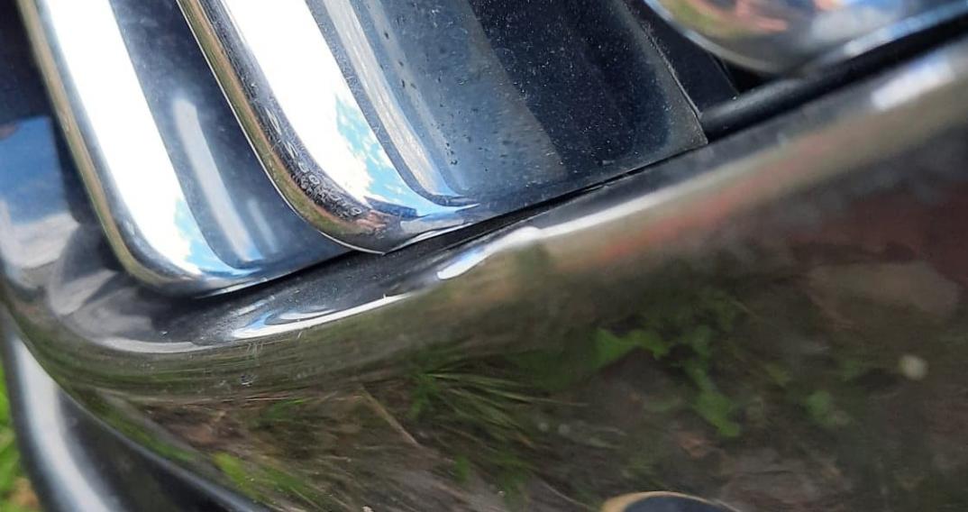 Jednak wczoraj sytuacja się powtórzyła - facet walnął dokładnie w to samo miejsce w moim przednim zderzaku, tuż obok grilla, w wystającą część zderzaka, która bardzo łatwo się wgniotła - jest tak ogromnym ignorantem i amebą umysłową, że po prostu cofa do momentu, aż nie spotka się z kolejnym samochodem i najwyraźniej robi to celowo. Sam z tyłu ma czarny, plastikowy zderzak, więc ma wywalone, jednak pozostałe samochody mają zderzaki w kolorze nadwozia i po spotkaniu z poruszającym się obiektem, może pozostać na nich ślad - tak się stało właśnie z moim zderzakiem.