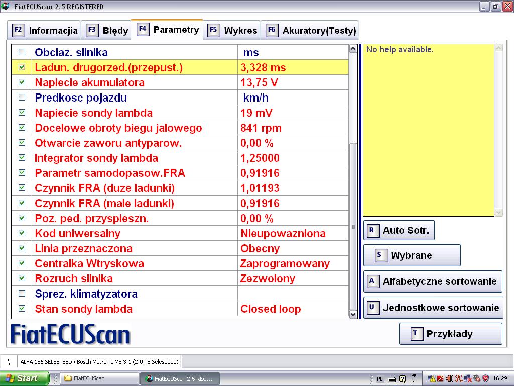 Dziś kilkadziesiąd razy próbowałem się połączyć z ECU w ,mojej 156, niestety wyrzuca mnie do menu. :( Ten niebieski kabelek się nie sprawdza, już mi działa na nerwy.Chciałem sprawdzić przepływomierz i z tego co zauważyłem na biegu jałowym wciskając do odcięcia miał około 290 km/h, czyli niezbyt dobrze. Być może to on jest przyczyną słabego zbierania się mojej Alfy z niskich obrotów. Chyba już padł. Niestety to jest zamiennik i nie oryginał. Jakoś w tamtym roku w czerwcu zamontowany. Reszta parametrów chyba już nie istotna udało mi się zapisać. Chyba powinno być 480kg/h tego powietrza w przepływce ,prawda? Może ktoś mnie poprawi jeżeli się mylę.
