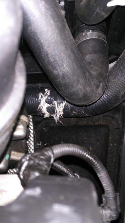 Niestety, kuna wróciła I widać ostraszacz ultradźwiękowy, sierść psa pod maską I comiesięczne opryskiwanie komory silnika płynem "na kuny" przestało zdawać egzamin. Oto skutki. Rura do kupienia jako cały zespół tylko za 404zł w ASO, używek na allegro brak. Aha, juz raz byla wymieniana razem z 3 innymi wezami od ukladu chlodzenia. Oto dzielo zniszczenia: