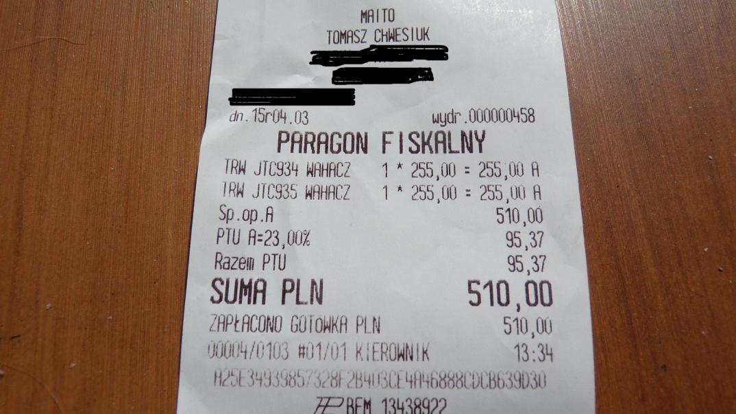 Skoro nie brałem od was wahaczy to czyje nazwisko jest na paragonie jako sprzedawcy?? Paragon z tego roku Przeszukaj najpierw swoje archiwum a potem peplaj na lewo i prawo Ponieważ to forum publiczne to zamazane zostały nip i adres sprzedawcy.