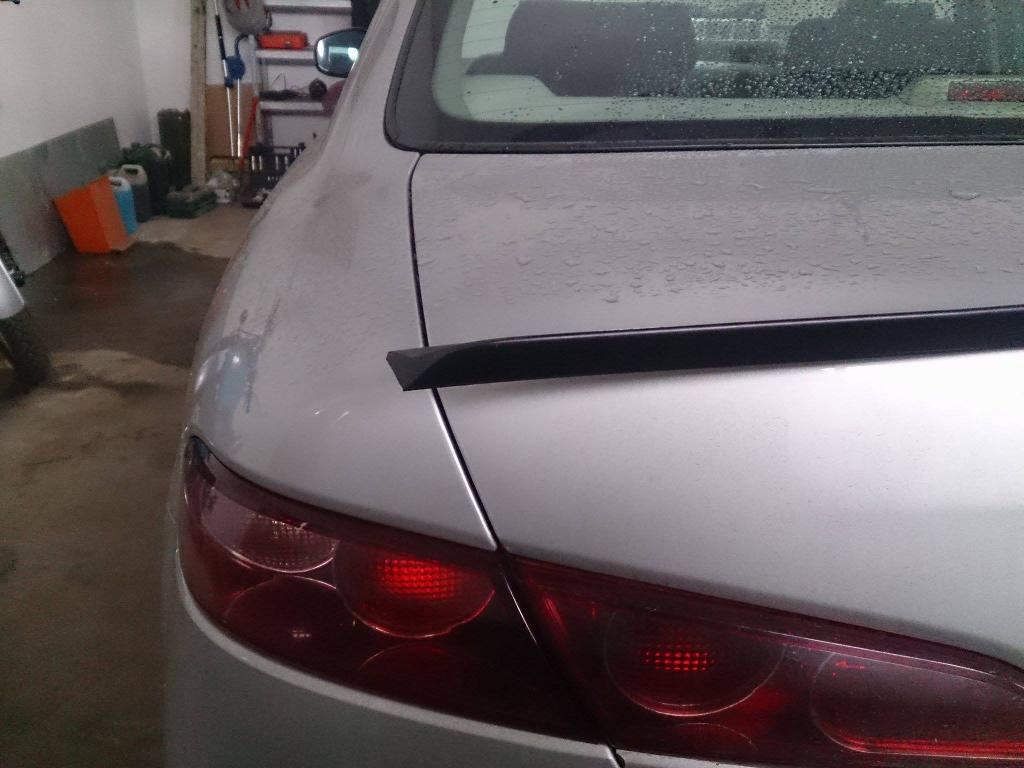 Jest progres :D Dodaje fotki spoilera jak to wygląda na Alfie;) Montowany z kolegą na kleju do szyb ale to naprawde niewielka ilość ok 2mm grubości i po ok 3mm odstępu od krawędzi aby nie wyszedł na boki,klej do szyb firmy Wurth.Spoiler i klape starałem się utrzymywać w ok 30 stopniach ciepła może i więcej aby spoiler był elastyczniejszy i klej lepiej złapał...Mam pytanie dodatkowe jak wam sie podoba alfa z rekinkiem na dachu? Rekinek ma normalnie płytke i ściąga stacje bdb;) Ja już sam nie wiem czy zakładać czy zostawić normalny krótki grubszy bacik? Foto: