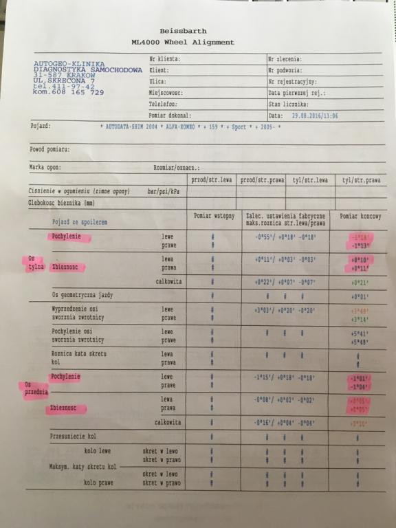 Nie jestem zadowolony do końca. Ponad to, tego typu ustawienia wcale nie zużywają więcej opon. Te małe makarony projektując 159 w swoim pijanym od prosecco widzie wymyśliły, że przednia oś ma być ROZBIEŻNA - czyli co zrobić aby przypadkowo nie prowadziła się jak po sznurku. Kto nie wie o czym mowa, polecam przejażdżkę BMW czy nawet przednionapędowym Audi A4. Klei aż miło na fabrycznych ustawieniach :-)