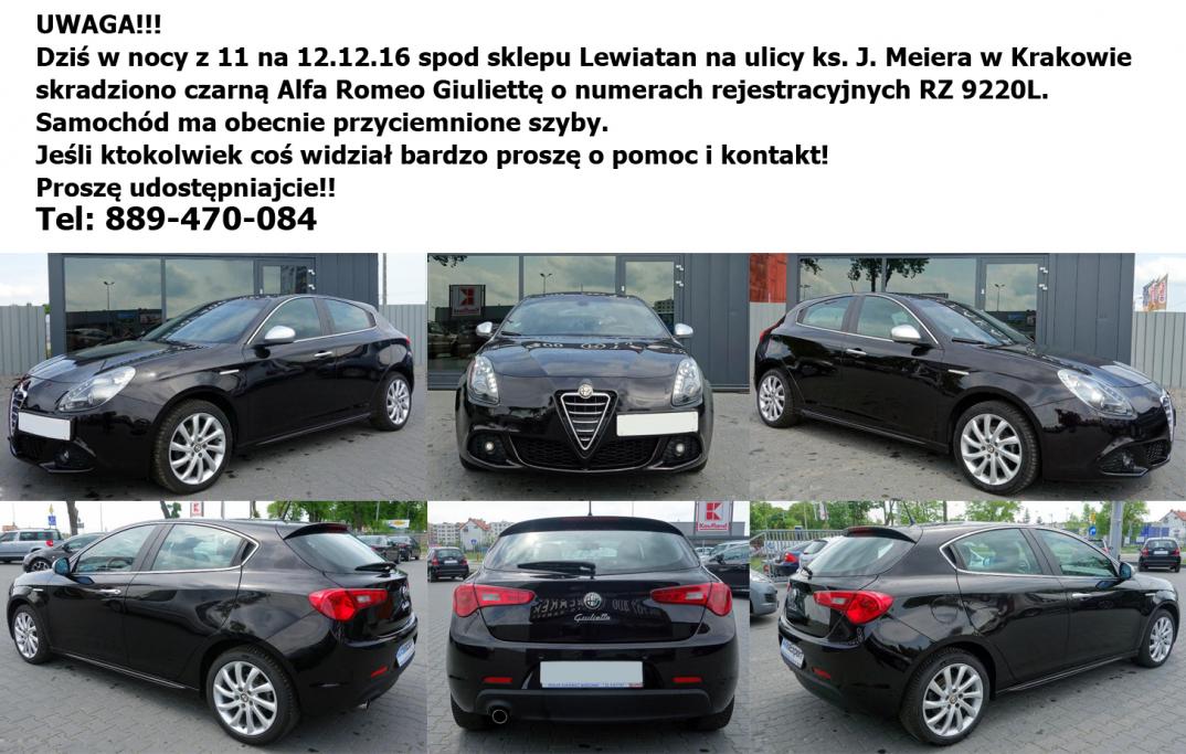 "Właściciele Giuliett przez najbliższe 7-10 dni proszeni są o zwracanie bacznej uwagi na swoje auta i niezostawianie ich zaparkowanych na dłużej w miejscach publicznych , zwłaszcza na noc. Doszły mnie słuchy że giną i będą ginąć Julki "na części" na terenie południowej Polski w najbliższym okresie stąd mój post.