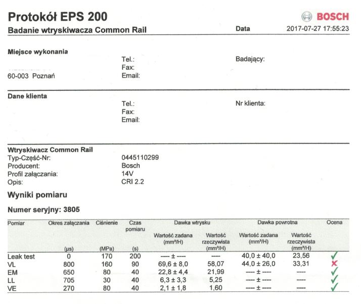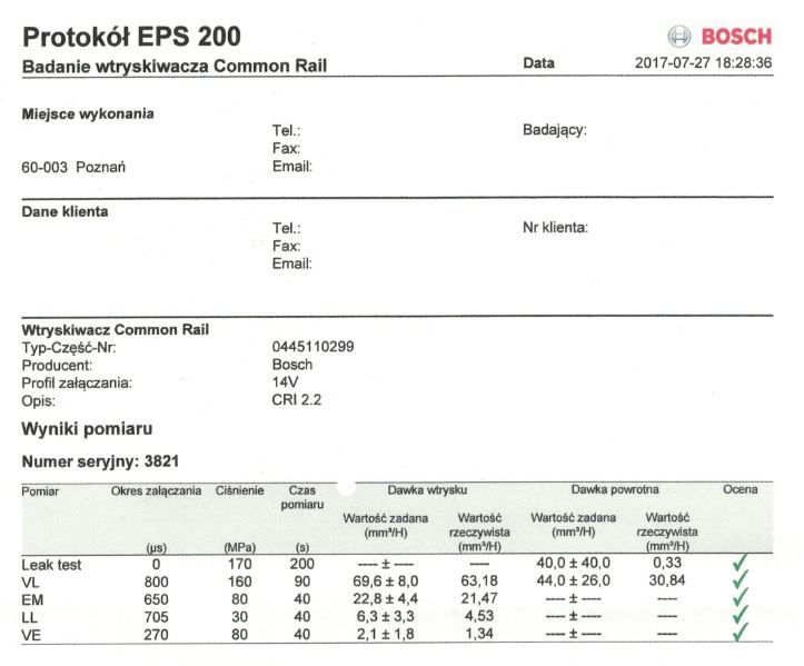 W przypadku pompy WS, wtryskiwaczy, nastawiam sie na diagnostyke u znawcow tematu, raczej bede polegal na partnerach Bosh Service, z racji logistyki w Poznaniu.