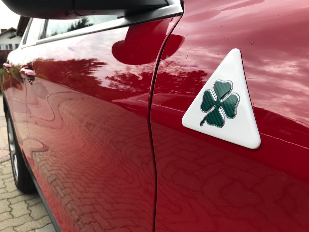 Koniczynka to dobrej jakosci "Mopar, Made in Italy, original Guliettta badge" lekko wygieta i pasuje na Stelvio blotnik jesli sie ja zalozy jeden centymetr nad zgieciem blachy i rownolegle do niej - czyli tak jak Stevio QV ma. Czesc # 0071806020-001.