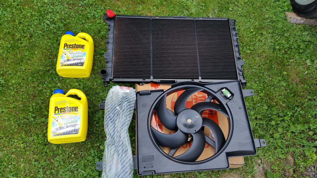 Zacząłem od wymiany czujnika temperatury (Febi). Dalej termostat ori (Behr), płyn chłodniczy i kompletny wentylator (ori). Wyciągnąłem i wypłukałem chłodnicę, brak widocznych uszkodzeń.