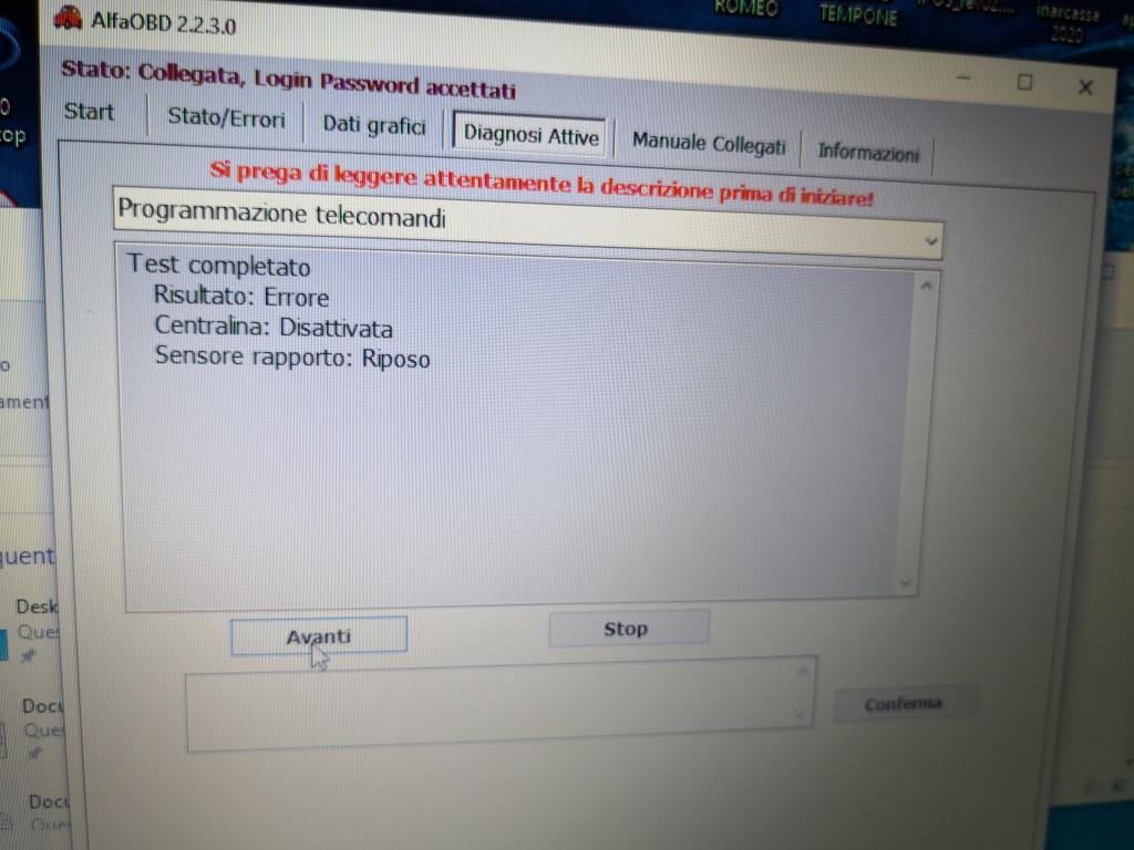 Ulteriori aggiornamenti sul malfunzionamento del telecomando, ho provato con il software alfaOBD ad effettuare la riprogrammazione della chiave del telecomando e il software mi diceva inizialmente