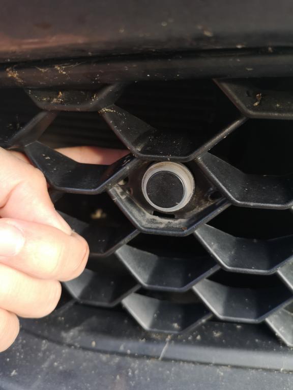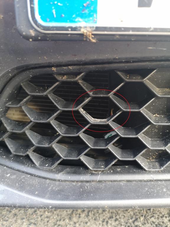 Nie ma, ponieważ jego tylna część trzyma się razem z czujnikiem, a przednia część całkowicie zniknęła (być może trafił to niefortunnie jakiś kamień, albo coś - nie kojarzę, żebym w cokolwiek uderzył, cały zderzak, jak i reszta kratki nie wykazuje żadnych oznak połamania). Na poniższym zdjęciu widać, że mogę od tyłu przytknąć całą tę część i niejako "zatrzymuje się ona" na kratce, brakuje jednak części, która by łapała to wszystko od przodu.