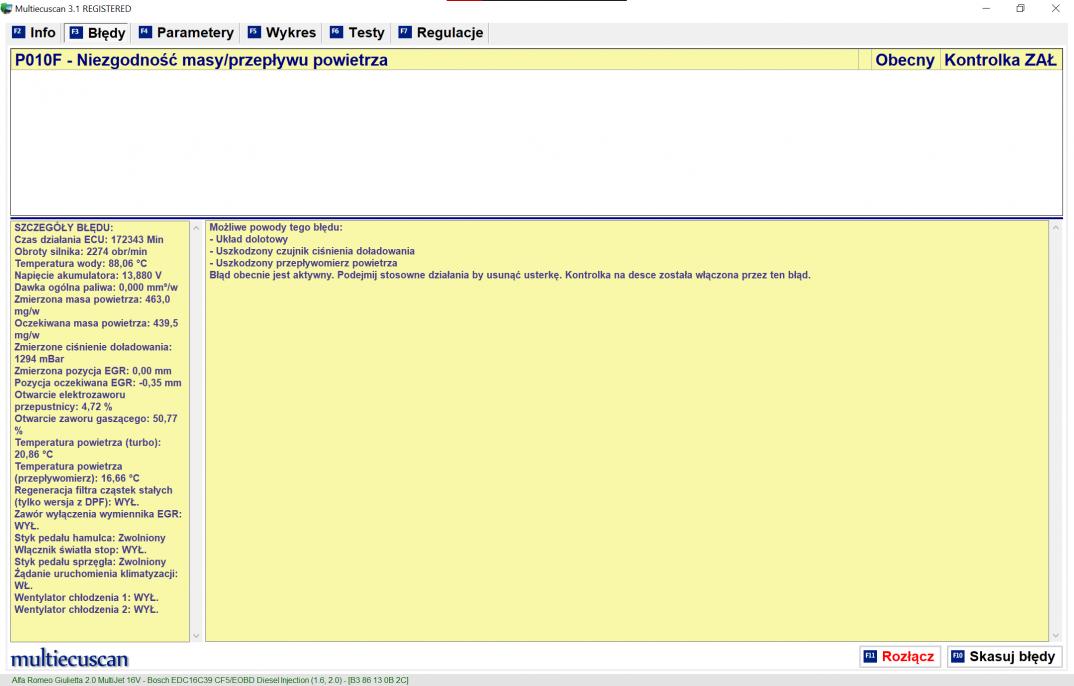 Witam od około miesiąca posiadam problem z Giuliettą mianowicie odcina mi moc w sytuacjach (ale nie zawsze) gdy mocno przyspieszam i odpuszczę gaz już się alfa nie zbiera a w komputerze widnieje błąd P010F - niezgodność masy/przepływu powietrza.