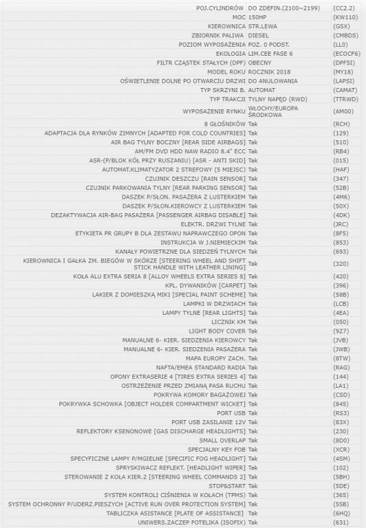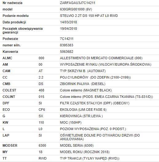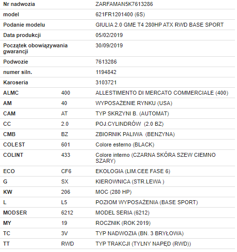 Witam. Czy mogę prosić o rozkodowanie VIN ZAREAEGX8M7646196. Potrzebuję wylistować wyposażenie mojego samochodu. Lub ewentualnie gdzie mogę sam to sprawdzić?
