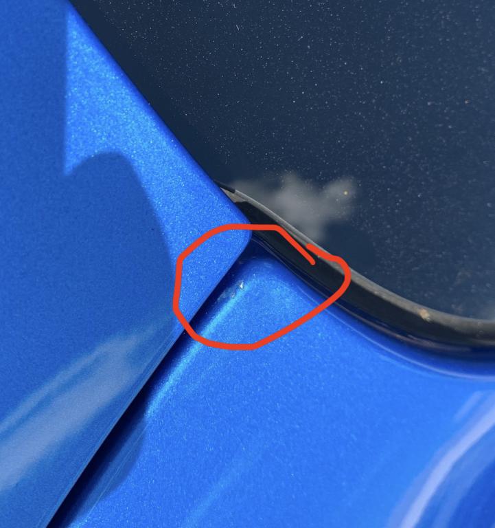 - Uszkodzona powłoka lakiernicza na błotniku w miejscu łączenia z klapą